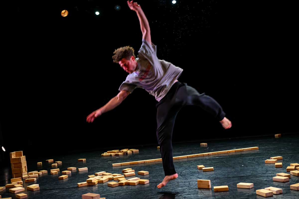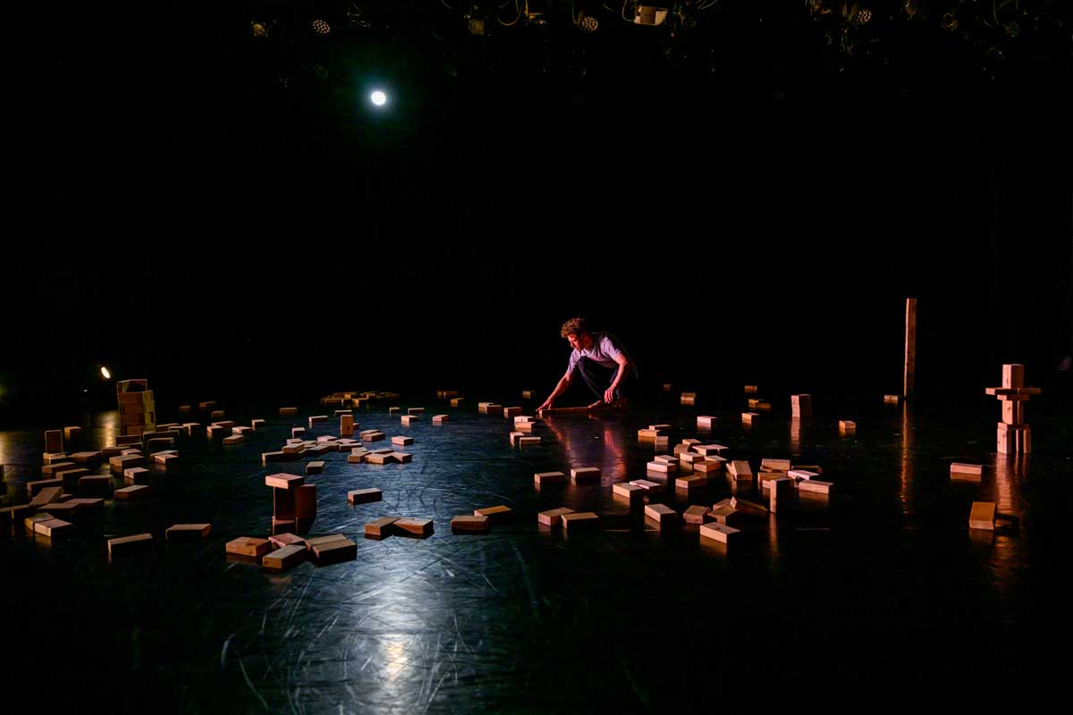 With serendipity, rigour and ingenuity, dance artist Josh Martin performs a solo together with 250 small cedar blocks. Moments emerge and transform: whimsical, primal, risky, futile and tender. Balance is fragile, tested, and there are no mistakes. Composer James B. Maxwell and lighting designer James Proudfoot frame and hold Josh with their sound and light, expanding and condensing his world. Developed through a collaboration with Josh that has spanned four years, blocking reveals the body, breath and stillness.
