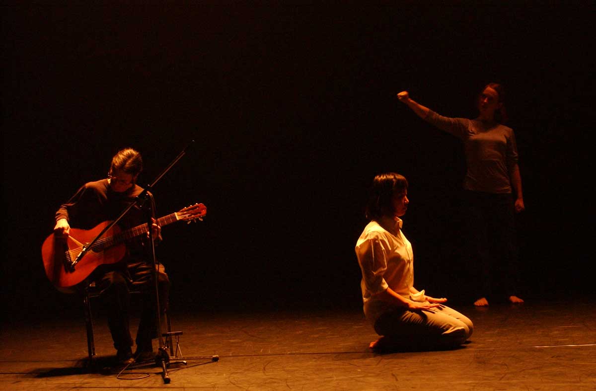 A meeting of improvised chance and choice directed by Helen Walkley and performed by dancers Jennifer Clarke, KT Shores, Cara Sui, and classical guitarist Simon Schumph.
